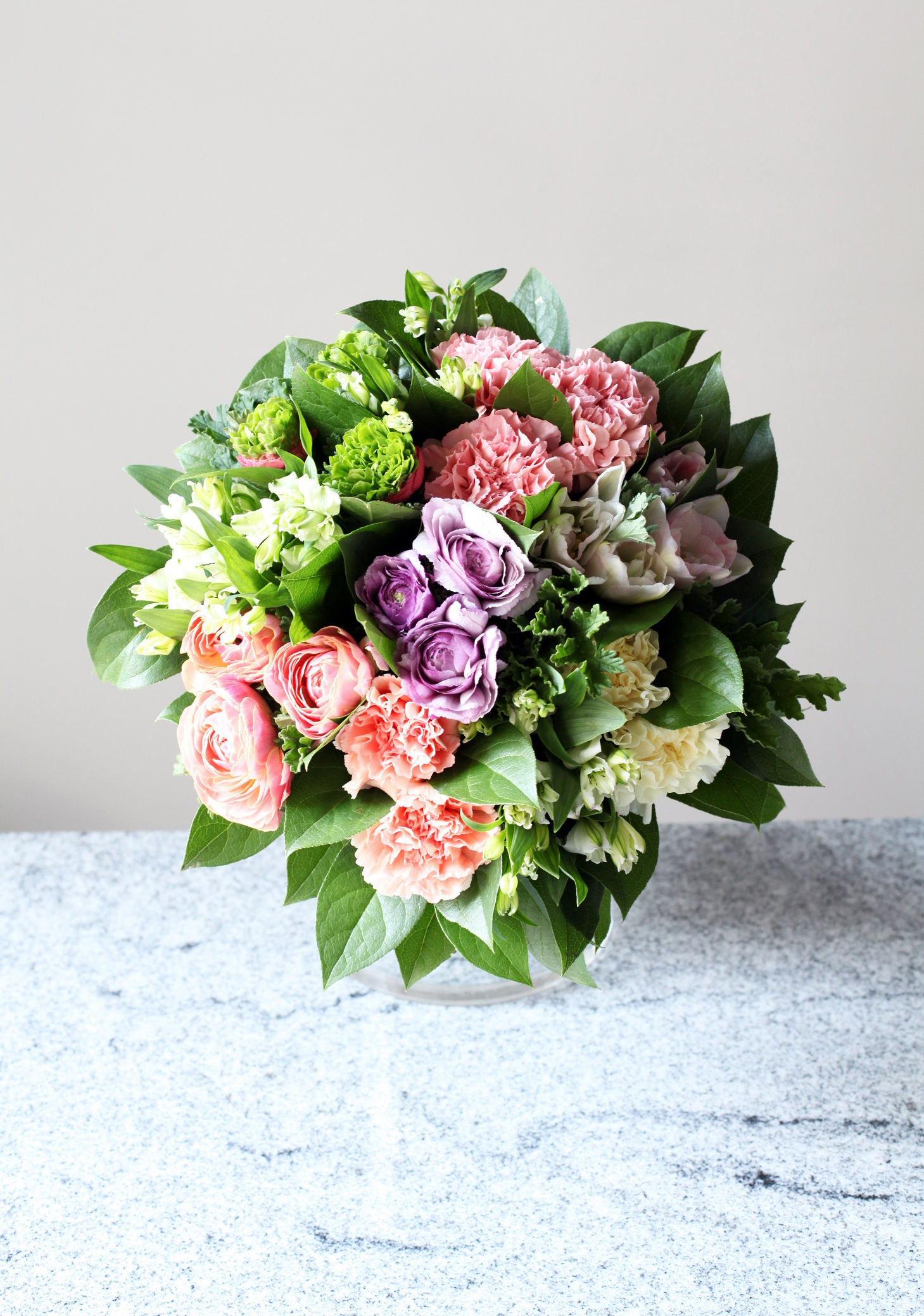 ラウンドスタイルでぎっしりグリーンとお花が詰まっています。3方見アレンジメントのようなダイナミックさはありませんが、洗練されてお洒落なギフトになります。ユーカリやハーブをふんだんに使用しているのでさわやかな香りもお届けできるアレンジメントです。おまかせグリーン・お花でお作りさせていただきます。詳しくは店頭までお問合せくださいませ。