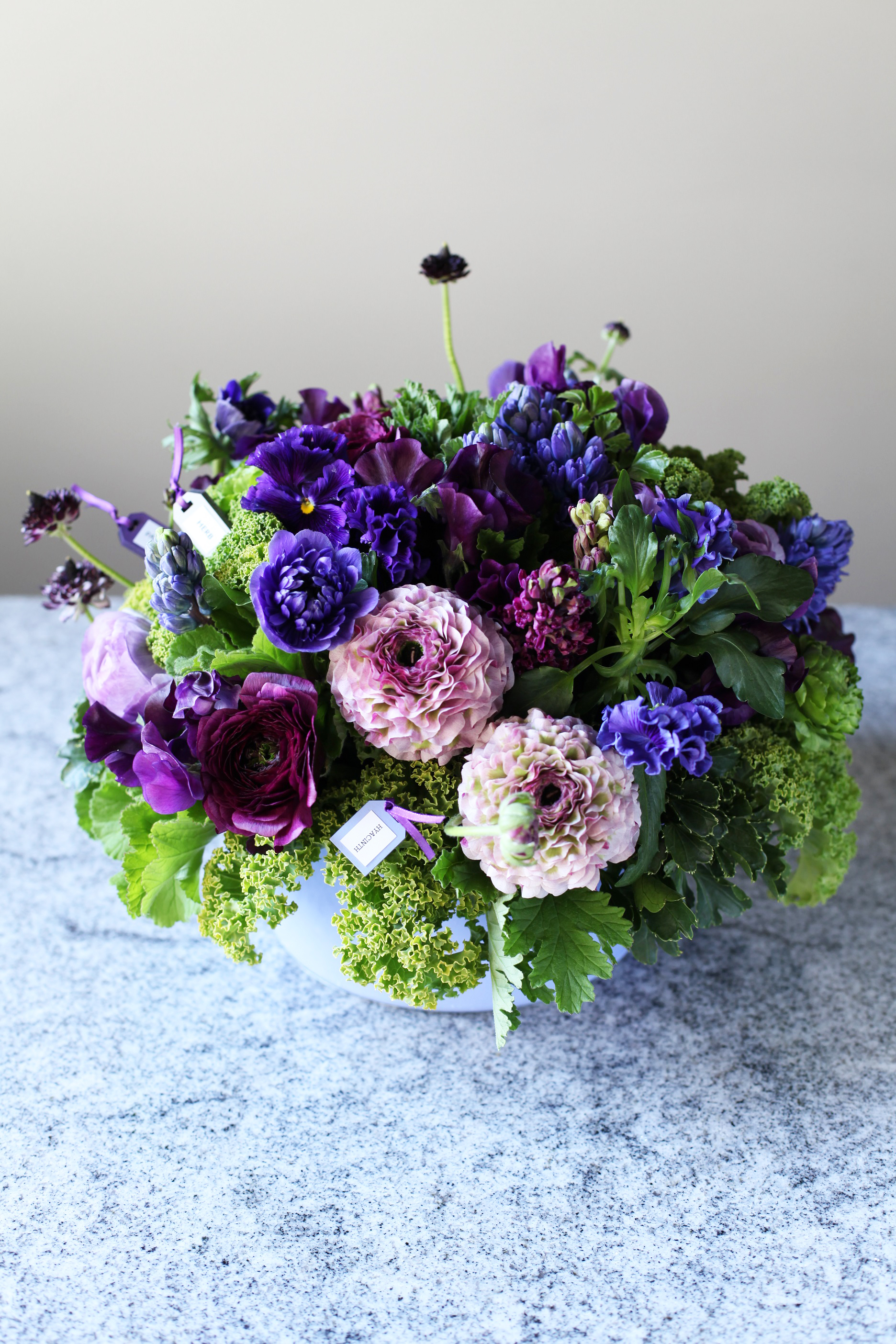優しい春の香りのヒヤシンス、さまざまな種類のラナンキュラスや…スイトピーやパンジー…お花はかわいく、色はベルベッドのような深い大人バイオレットが中心です。