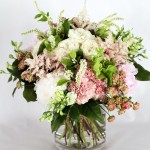 シャクヤクを使用してベージュピンクやオフホワイトのカラーをミックスした落ち着きのあるロマンチックなブーケを作りました。今回は葉物や小花で動きのあるブーケに挑戦です。器のサイズを選べはテープを外してもきれいに飾れます。