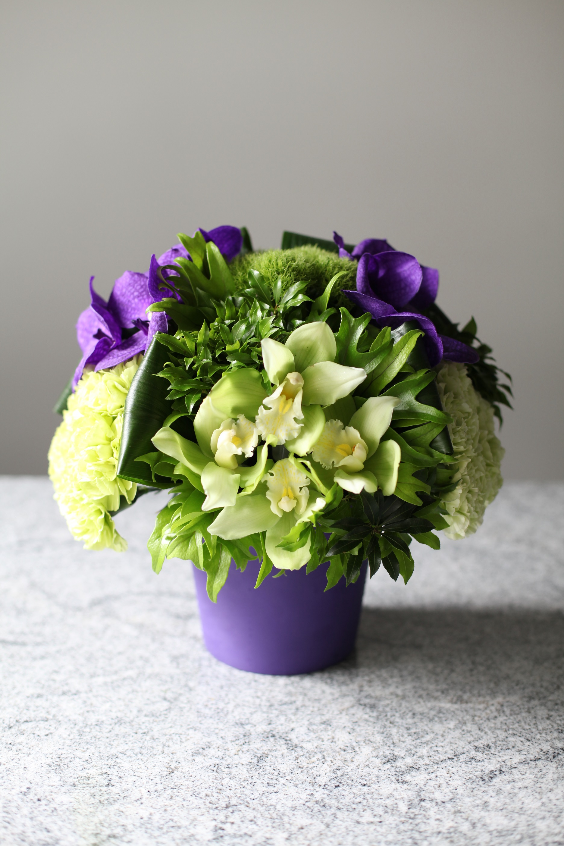 ゴージャスリッチな紫バンダ、上品なチューリップアンスリウム 、大人シックな深い色のシンビジウム グループドハンドタイドで作り込む洗練された都会的な夏のブーケです。