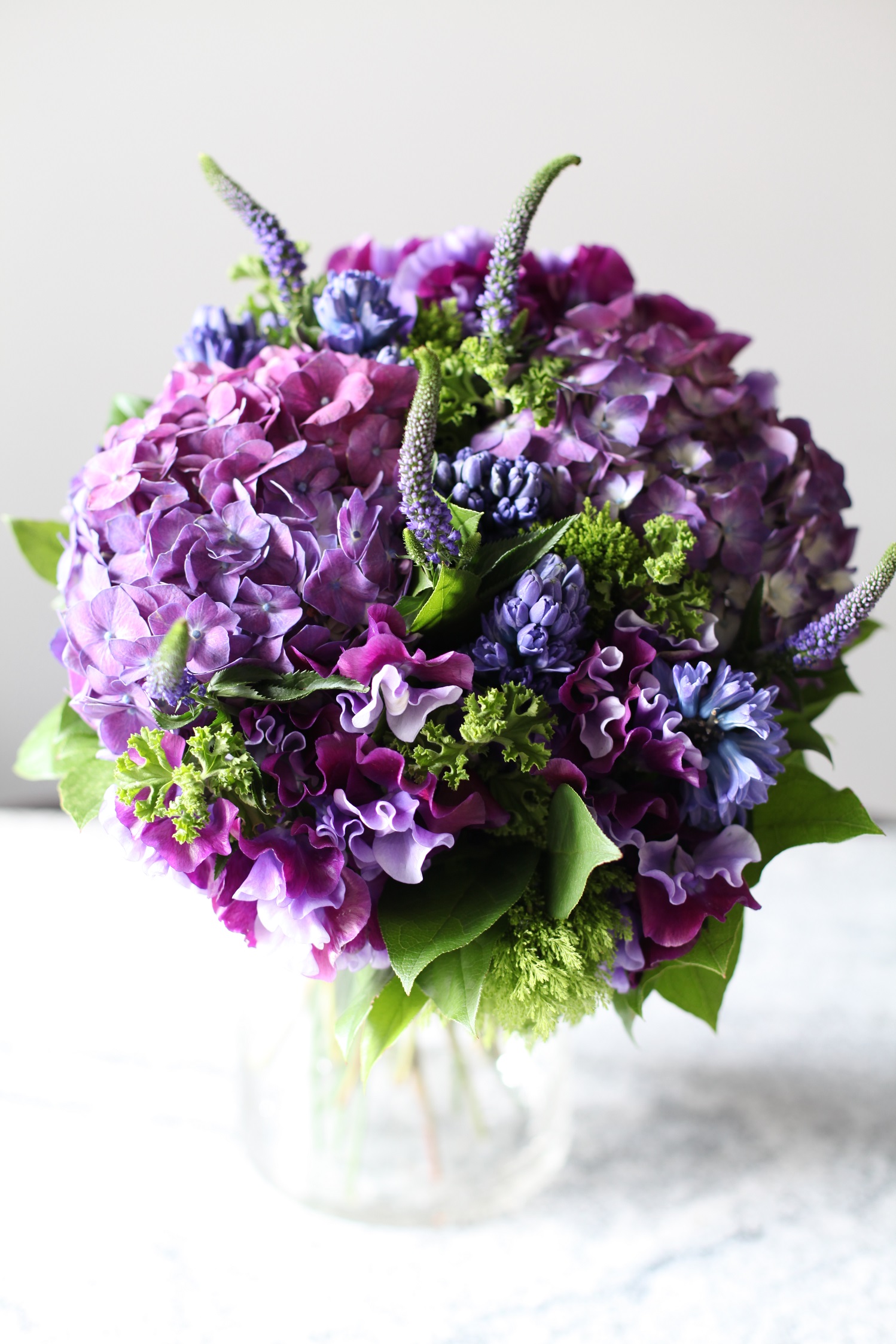 スイトピーヒヤシンス…いつまでも変わることのない定番の美しさパープルの花束